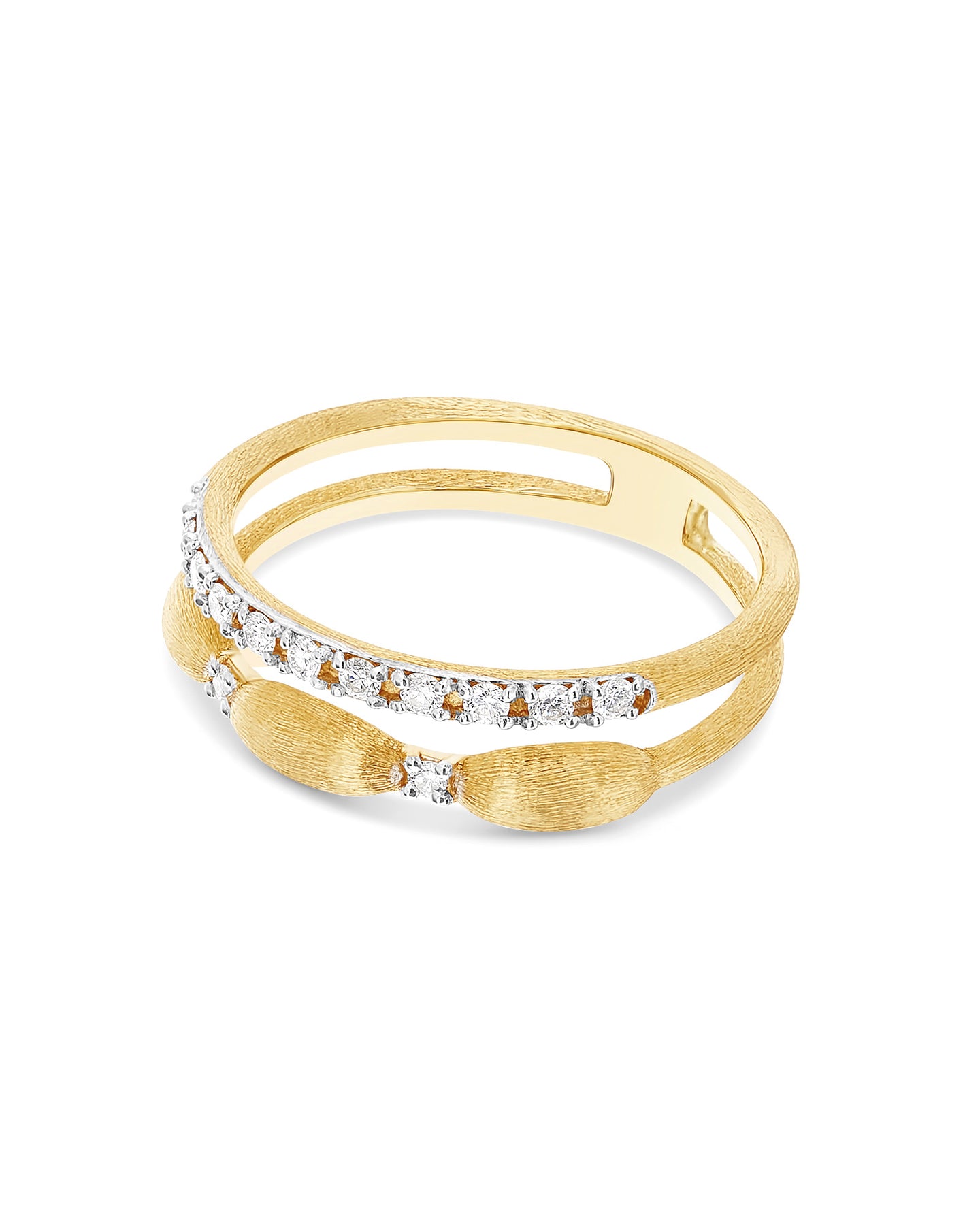 Diamanti e oro giallo 18 kt si rincorrono in questo sofisticato anello, avvolgendo teneramente il dito e facendolo brillare.