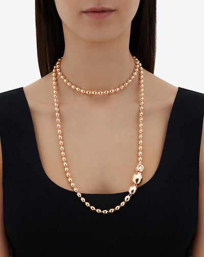 The pearl necklace according to nanis: 18kt rose gold boules, that culminate in a clasp of diamonds ready to embrace each of the beads of this jewel, opening it to its endless possibilities. This string of gold pearls can in fact become a sensual choker, but also a classic chanel, or a transgressive y necklace. Interpret it according to your look and your personality!