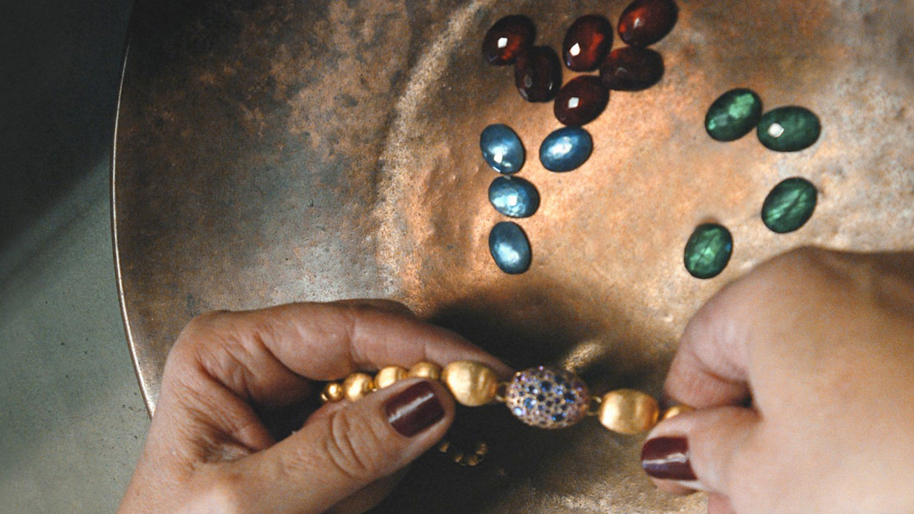 The Reverse necklace, in hand-engraved 18kt gold and natural gemstones, reinvents elegance. The iridescent pendants adapt naturally to any style.