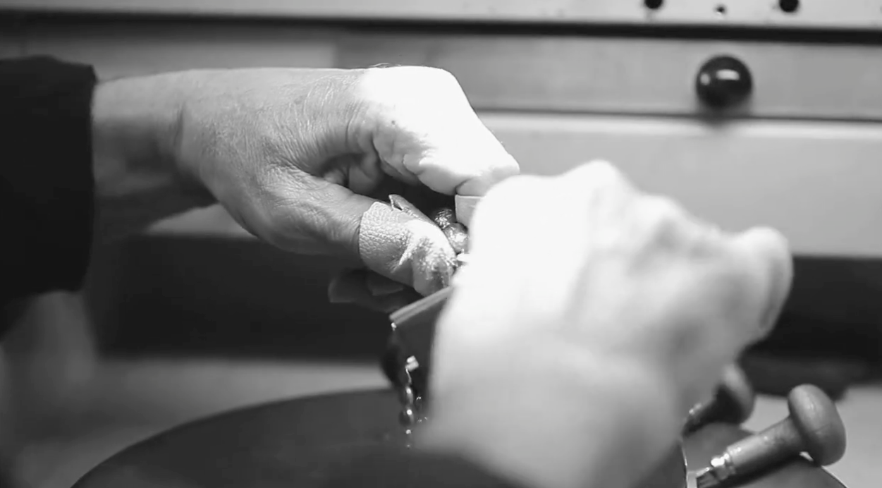 Tutti i nostri gioielli sono rifiniti a mano. Levigature, incisioni, lucidature e ogni altro tipo di finitura viene eseguita con pazienza dalle mani nei nostri artigiani. Ogni lavorazione ha difficoltà diverse. Differenze dovute alla forma dei gioielli. Difficoltà accresciute dalla presenza di spigoli, di modanature, di morbide volute o di superfici perfettamente piatte, da interstizi irraggiungibili e da elementi particolarmente delicati. Ecco che a volte diventa impossibile lucidare a spazzola, come avviene comunemente, alcuni pezzi con angoli nascosti e apparentemente inaccessibili. Ci siamo rivolti allora alla tradizione secolare del mestiere e da essa abbiamo recuperato l’antico metodo della lucidatura a filo. Un modo semplice ed efficace di lucidare concavità altrimenti irraggiungibili. Una lavorazione elementare che consiste nel far scorrere avanti e indietro ripetutamente nell’incavo che si desidera lucidare un filo di cotone, applicando una lieve pressione, così fino al raggiungimento del risultato desiderato. Una lavorazione lenta e precisa, la ripetizione di un gesto semplice come la goccia d’acqua che leviga la roccia.