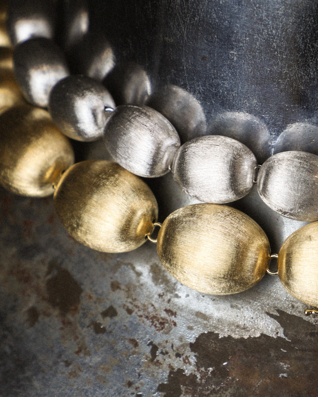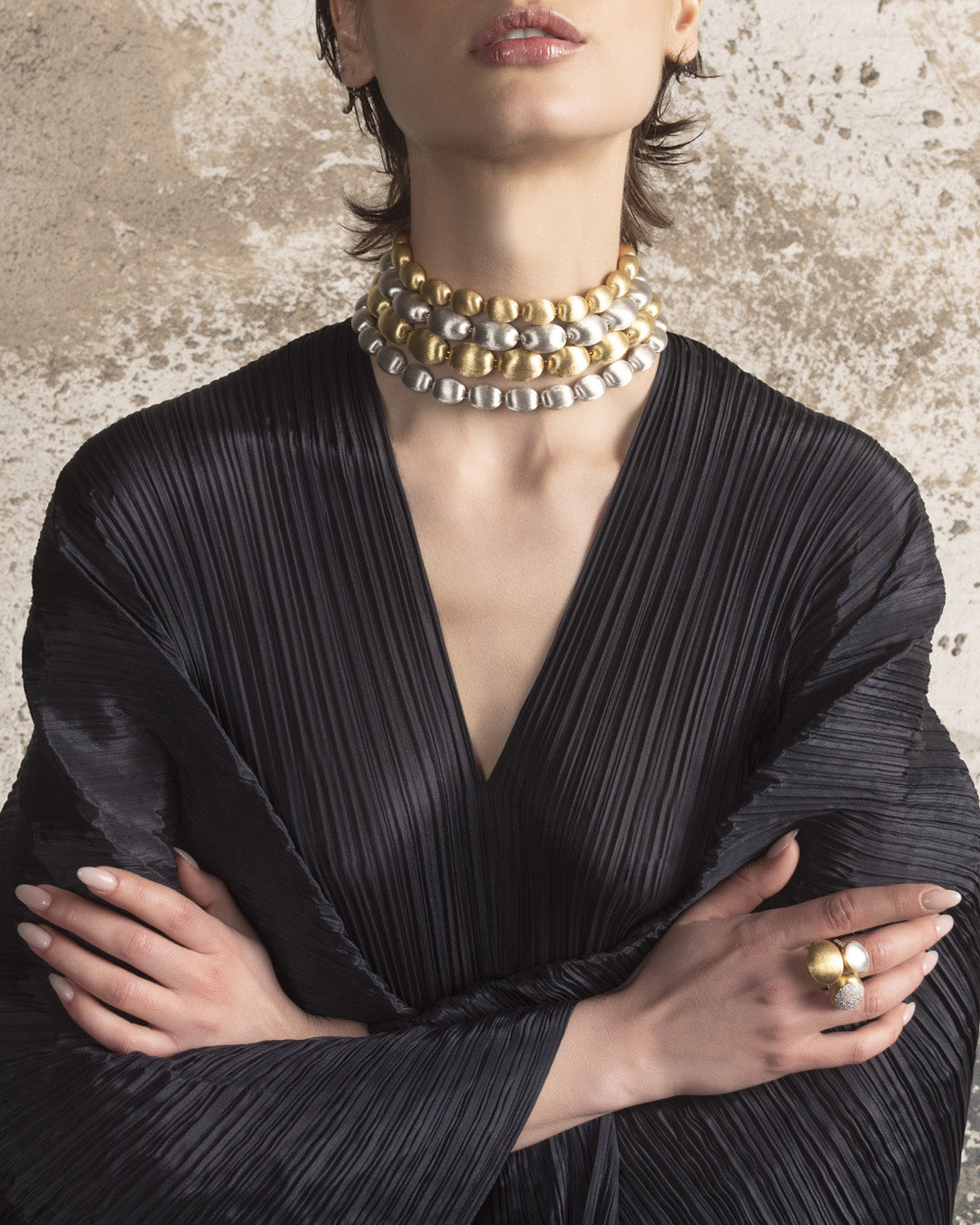 Un design compiuto e perfetto; una boule in oro 18kt finemente incisa con la tecnica del bulino e abbracciata da eleganti diamanti.