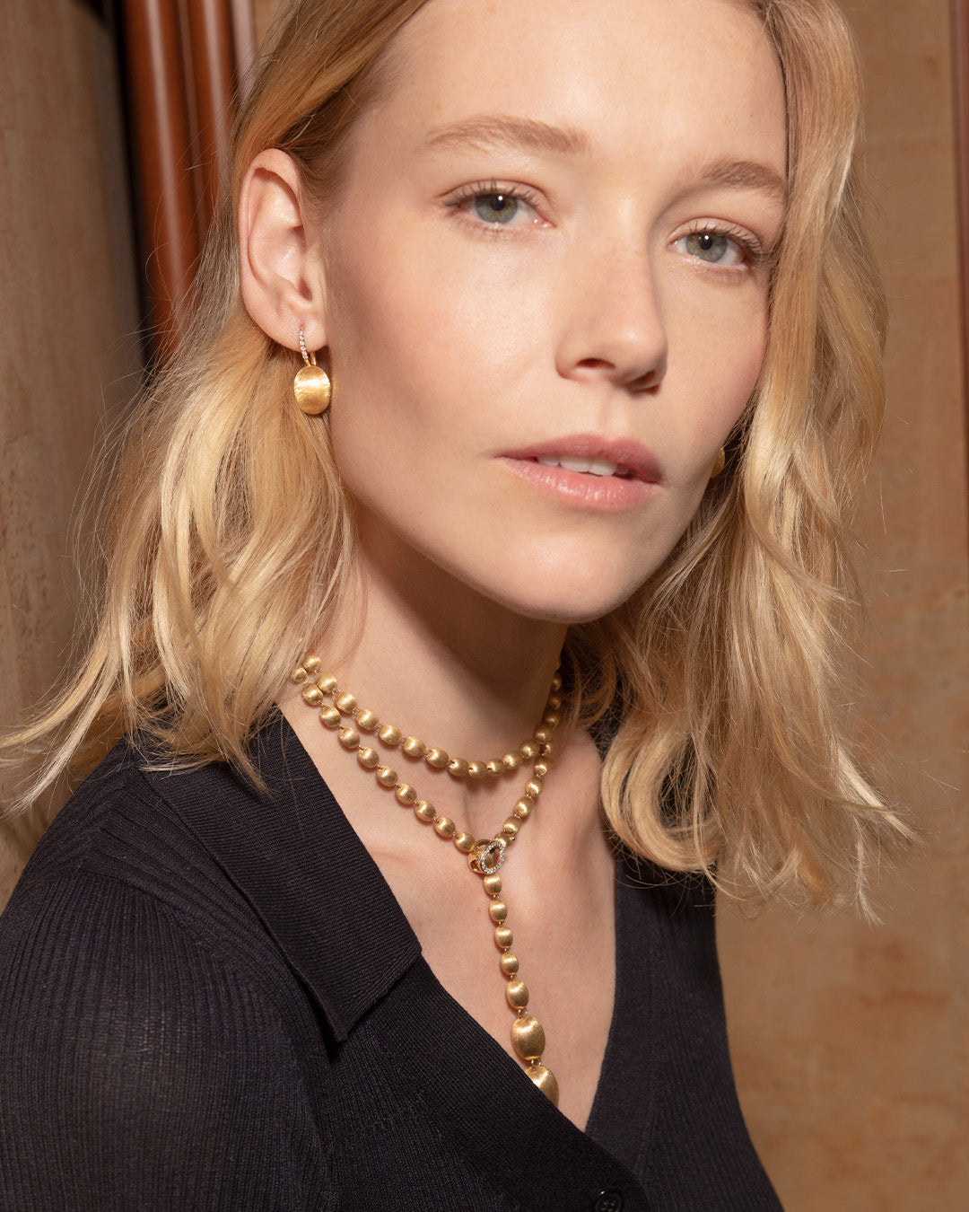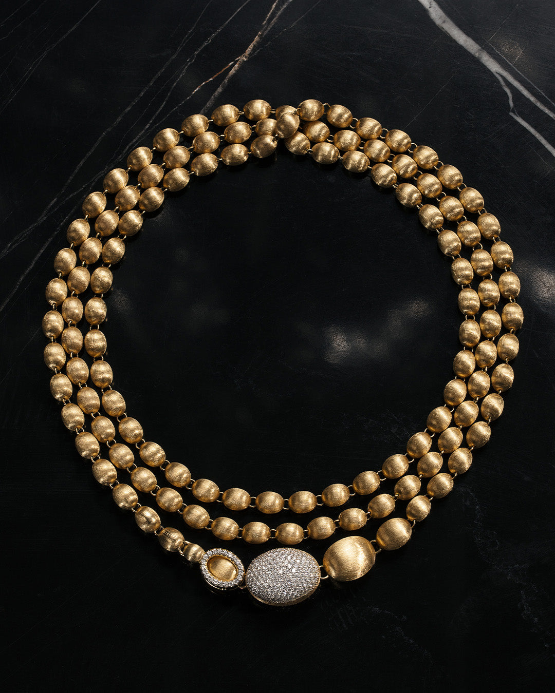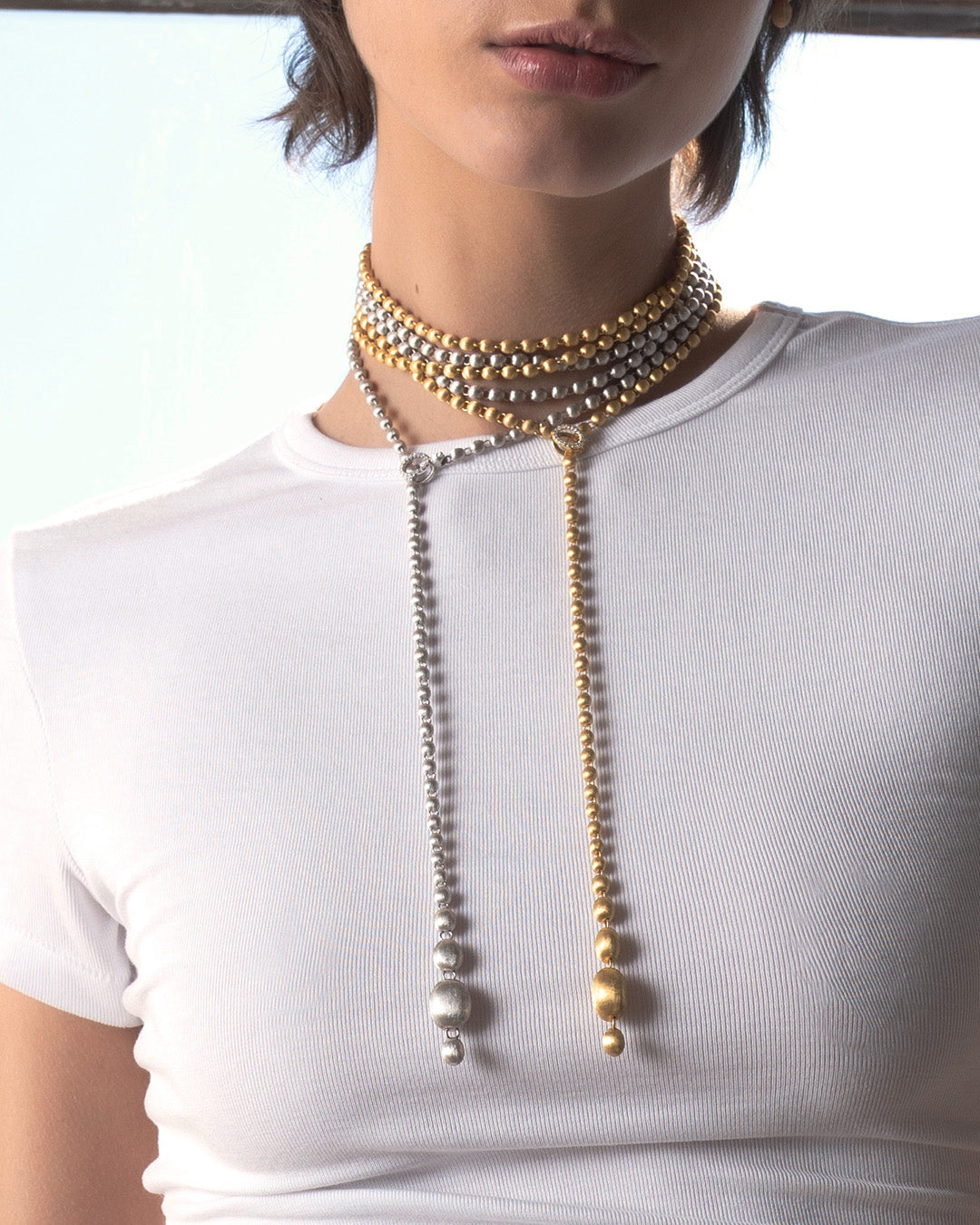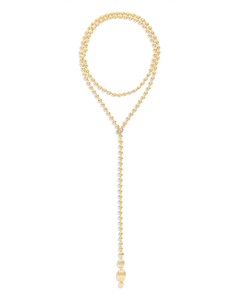La chiusura può essere agganciata a ciascuna delle boules in oro, in modo da dare la possibilità di indossarla nella misura desiderata.