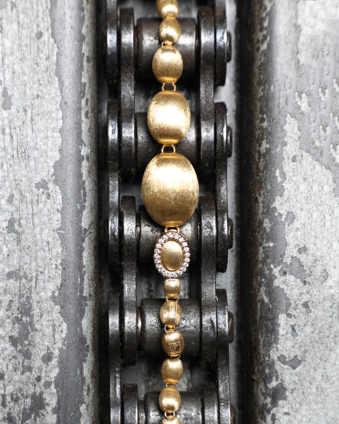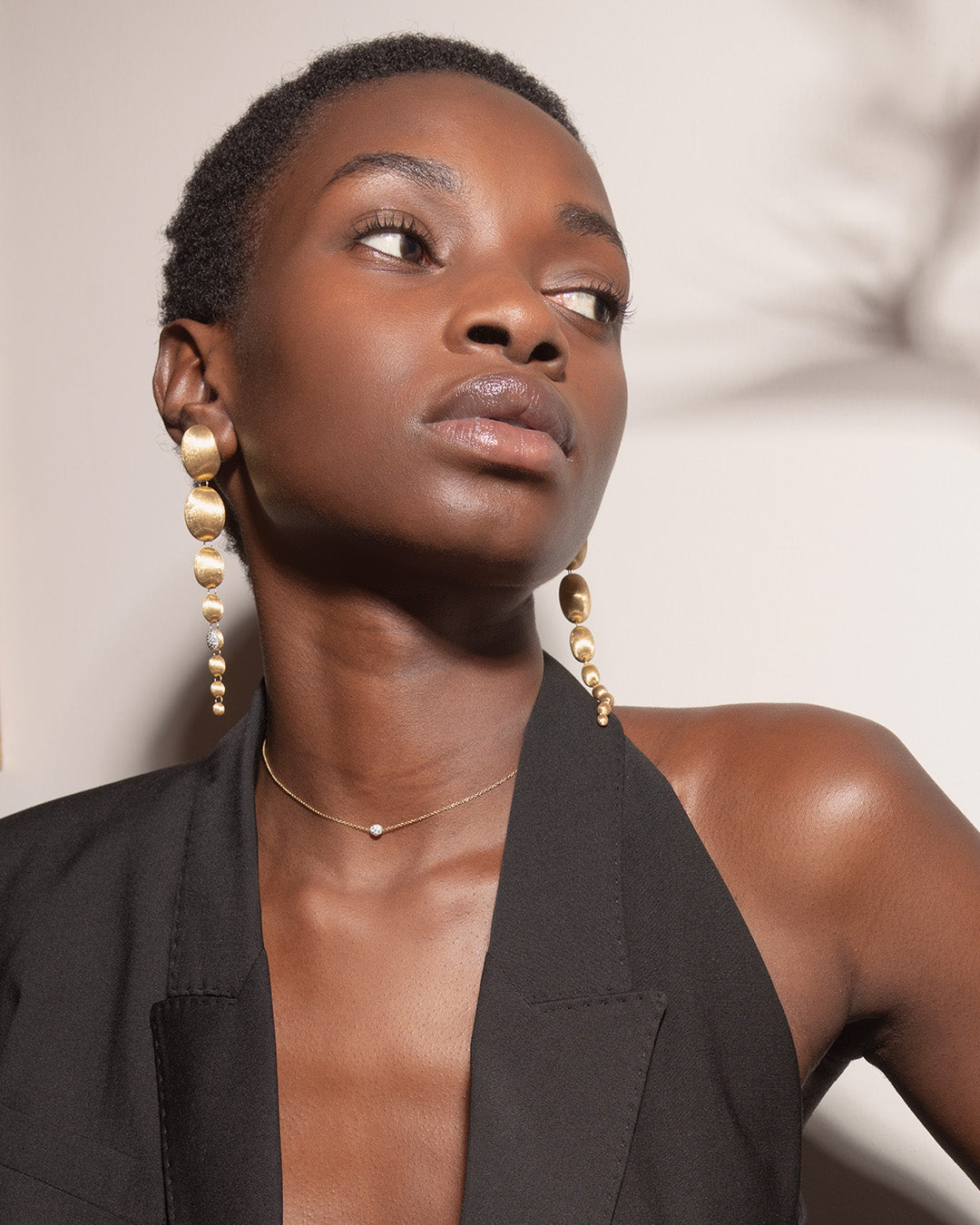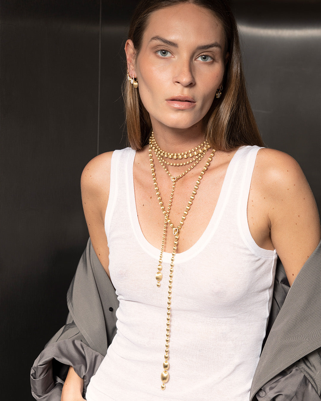 La chiusura può essere agganciata a ciascuna delle boules in oro, in modo da dare la possibilità di indossarla nella misura desiderata.