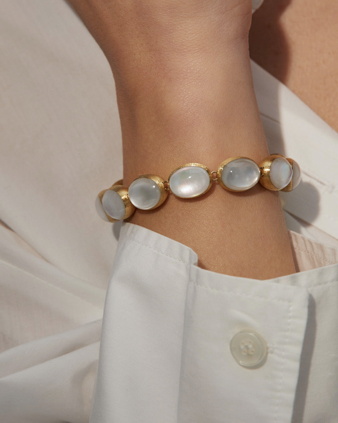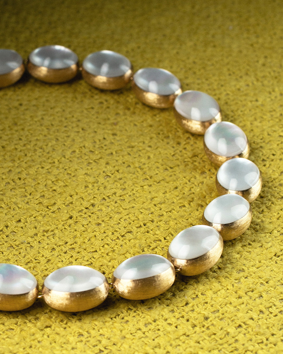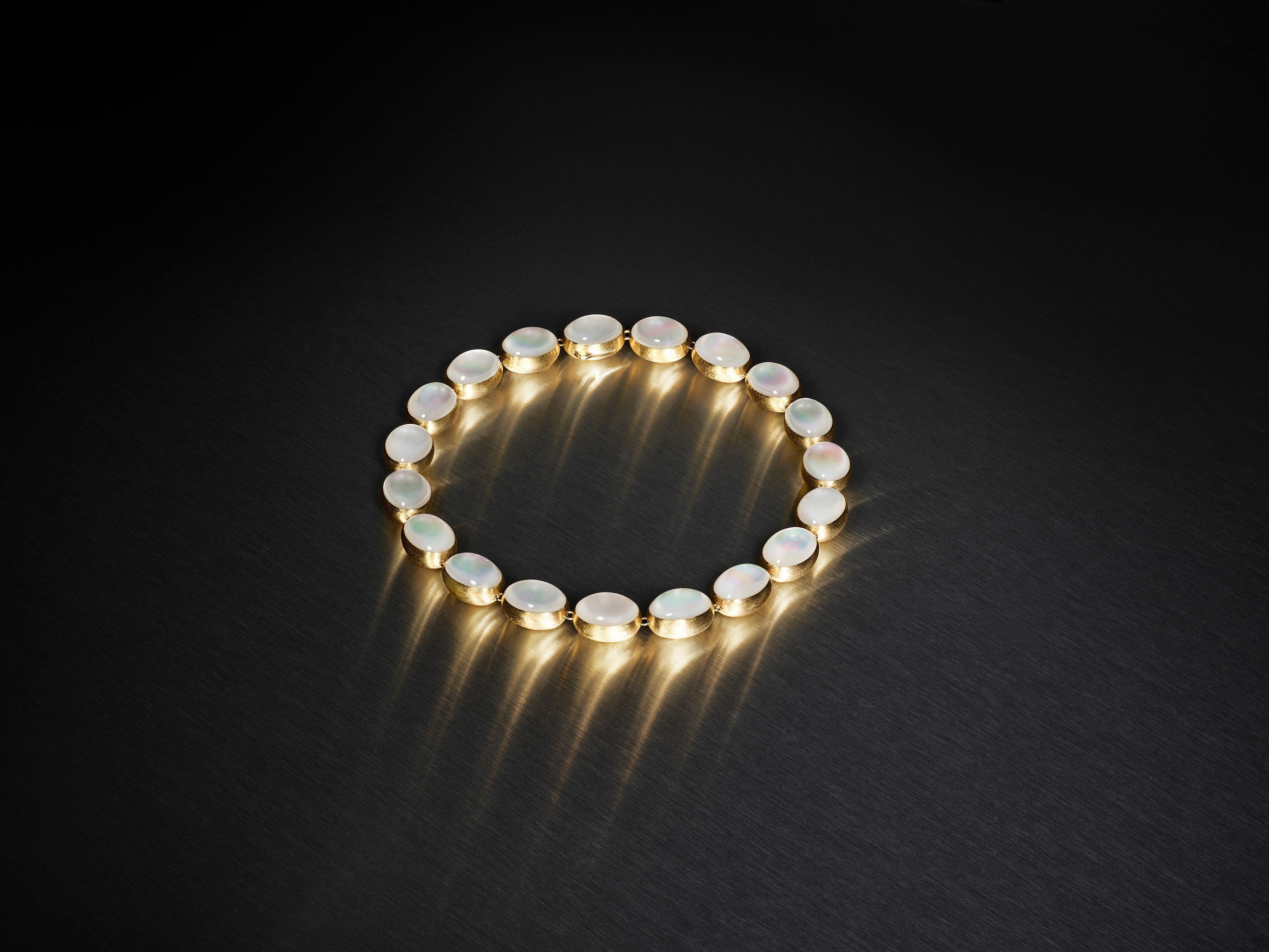 Da un lato, l’oro 18kt inciso a mano rivela una texture setosa che richiama la forma del classico collier di perle; dall’altro, la madreperla aggiunge una sfumatura cangiante che ne esalta la lucentezza.