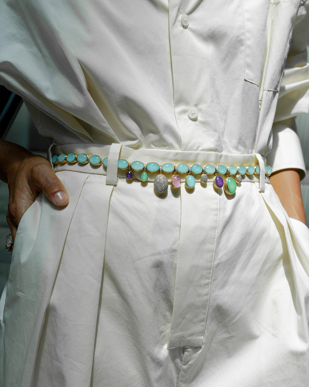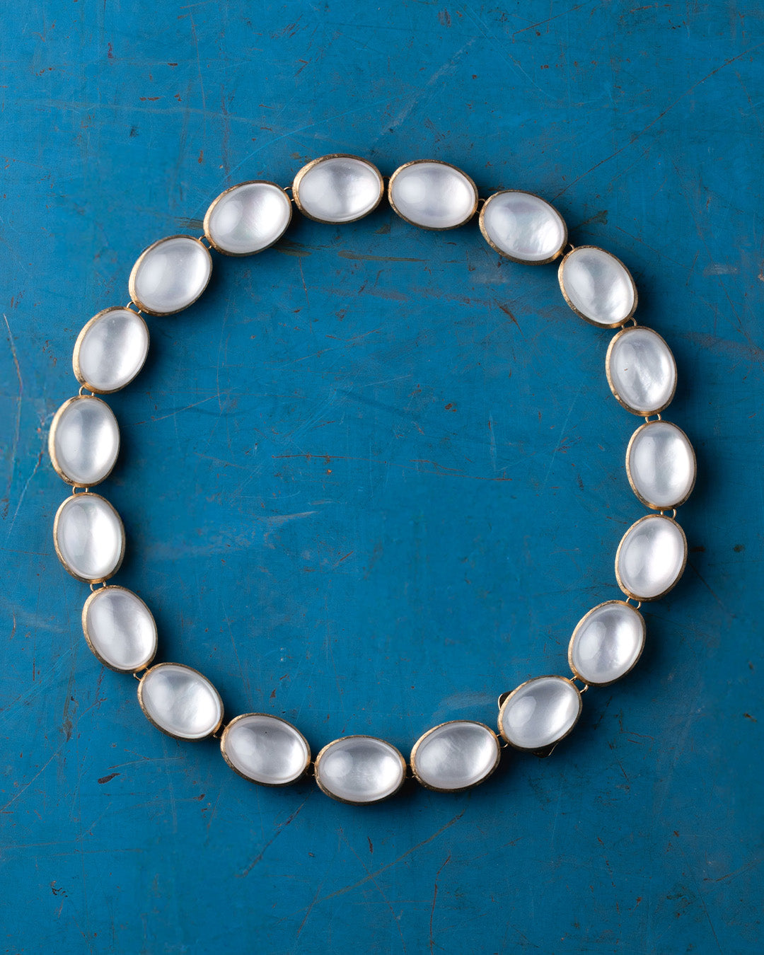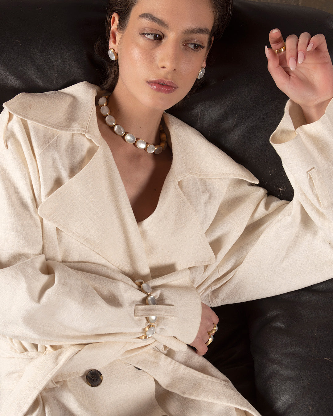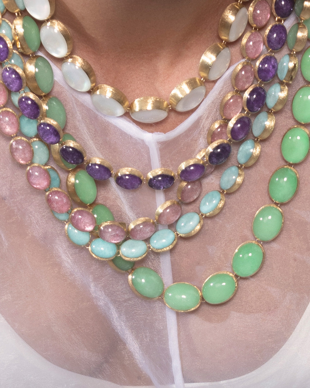 Da un lato, l’oro 18kt inciso a mano rivela una texture setosa che richiama la forma del classico collier di perle; dall’altro, la madreperla aggiunge una sfumatura cangiante che ne esalta la lucentezza.