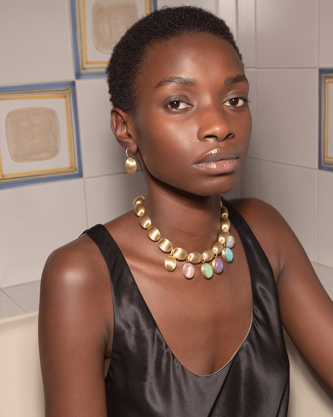 Una notte d’estate, la dolce brezza sulla pelle, il cielo che si veste di luce lunare. Il choker Muse, nella versione double face Dolcevita con madreperla, celebra la bellezza pura e l’eleganza senza tempo di Nanis.