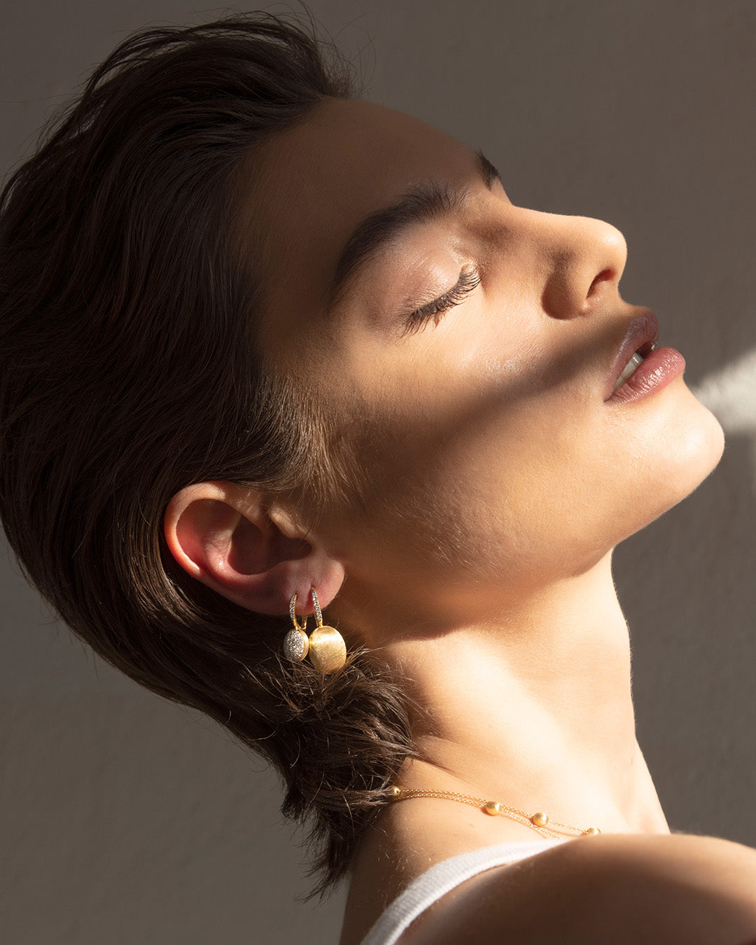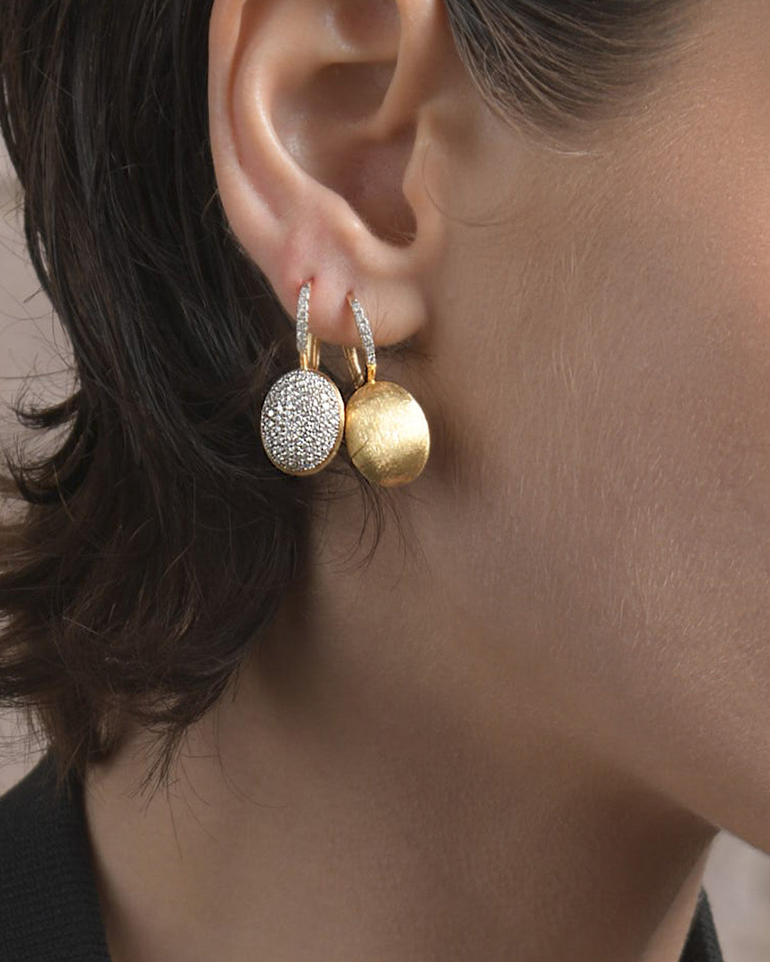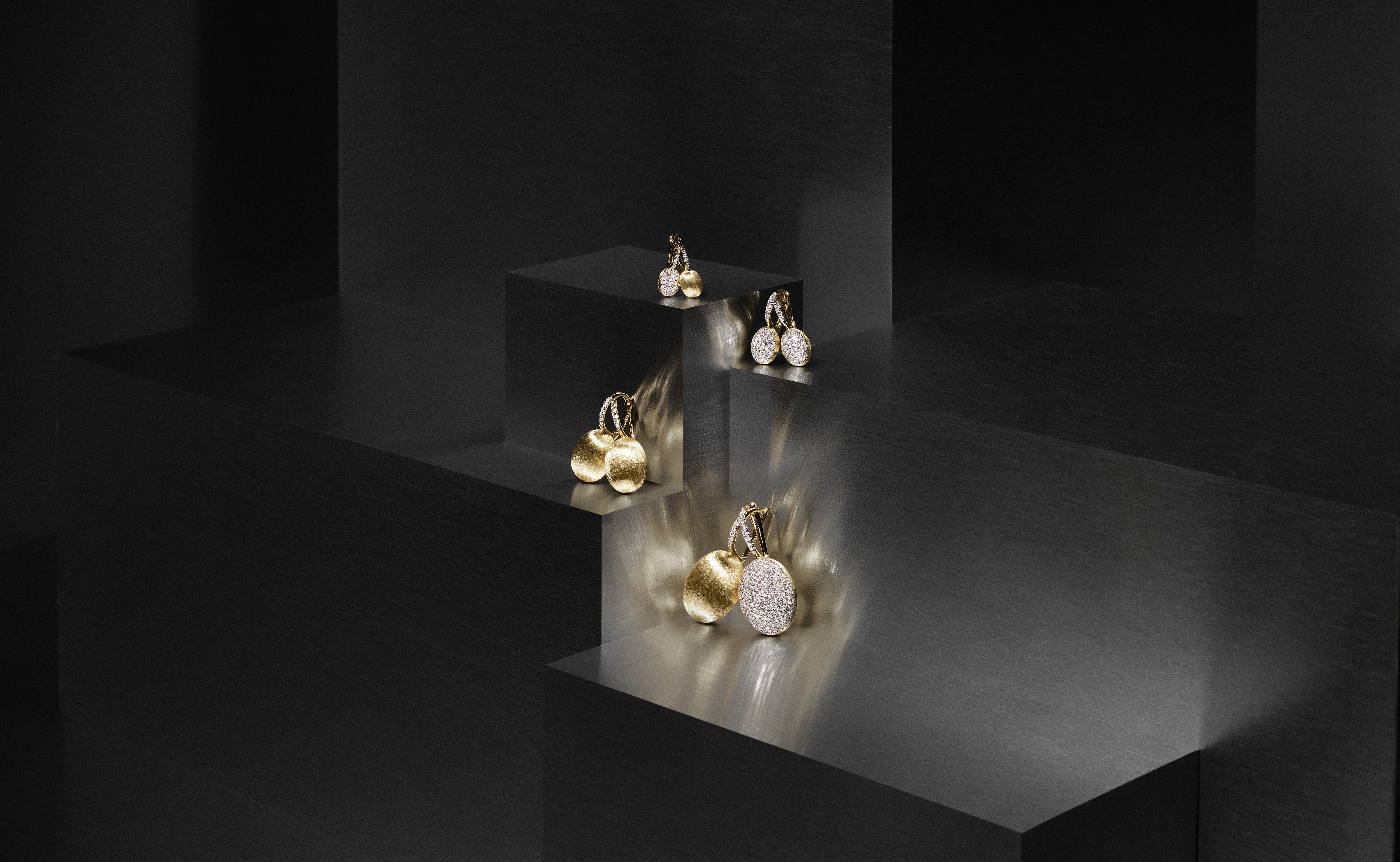 Eleganti orecchini in oro giallo e diamanti. La superfice dorata e irregolare, interamente incisa a mano dai nostri artigiani con uno speciale bulino millerighe, crea insieme ai diamanti un prodigioso gioco di luci da abbinare ad un look tanto elegante quanto casual.
